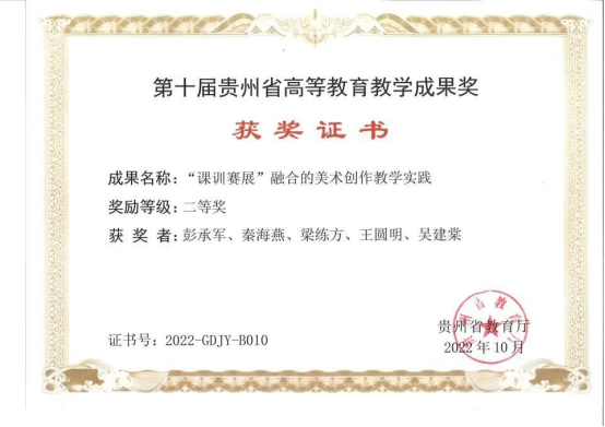 美术学科在2004年由贵阳师范高等专科学校的美术系与贵阳金筑大学轻工系设计教研室合并组建。历经20余年的发展,成果丰硕。近年来获贵州省文艺奖一等奖1项、二等奖1项、三等奖2项;获国家艺术基金美术创作项目2项、青年艺术创作人才资助项目4项,入选省级重大美术创作工程2项,主持完成、在研省级研究项目20余项;作品参加国际性、全国性美术展览50余件,获国际性专业奖项2件,3件入选第十三届全国美术作品展览并有1件获进京作品,2件入选第十四届全国美术作品展览并有1件获进京作品;作品获中国美术馆收藏3件。下一步,美术学院将以学校建设数智科技为特色的应用型大学为契机,加强设计类专业的数智化转型;擦亮美术学专业师范性底色,夯实办学基础,把美术学专业建设为省级一流本科专业;培育建设、申报“美术与书法”专业硕士学位授权点。