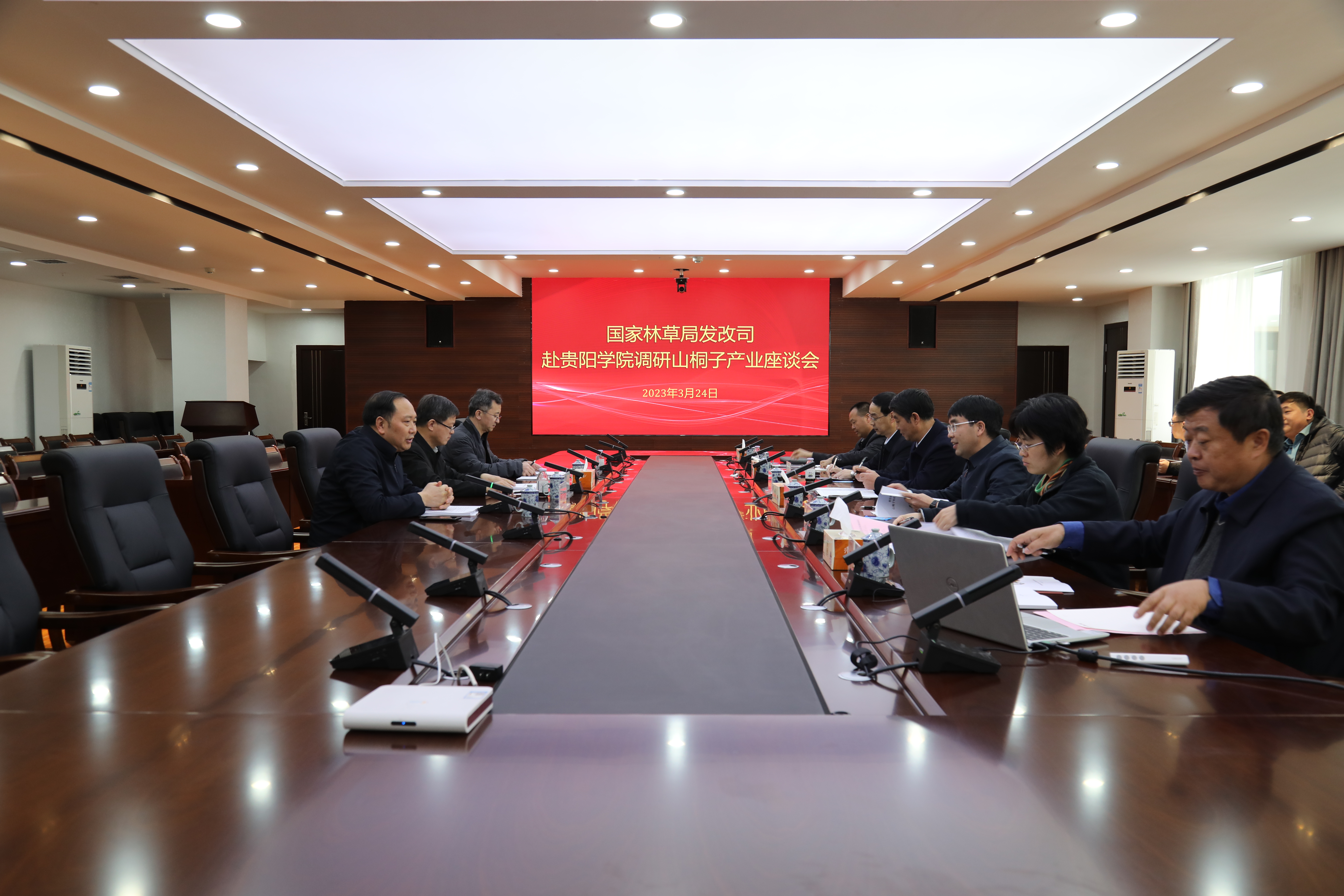 2023年3月24日,国家林草局发改司司长刘树人,木材行业处处长李斌,贵州省林业局副局长向守都,总工程师侯拥军,对外合作与产业处处长胡志伟一行,到金年会jinnianhuicom调研木本油料山桐子产业发展情况,并召开座谈会。金年会jinnianhuicom党委书记吕保平,副校长李灿陪同调研并出席座谈会,食品与制药工程学院、科技处相关负责人参加座谈会,会议由向守都主持。