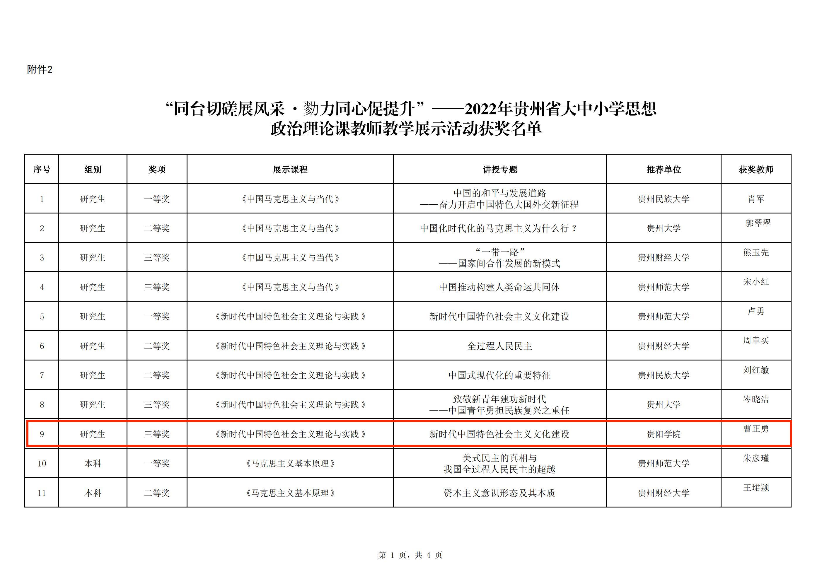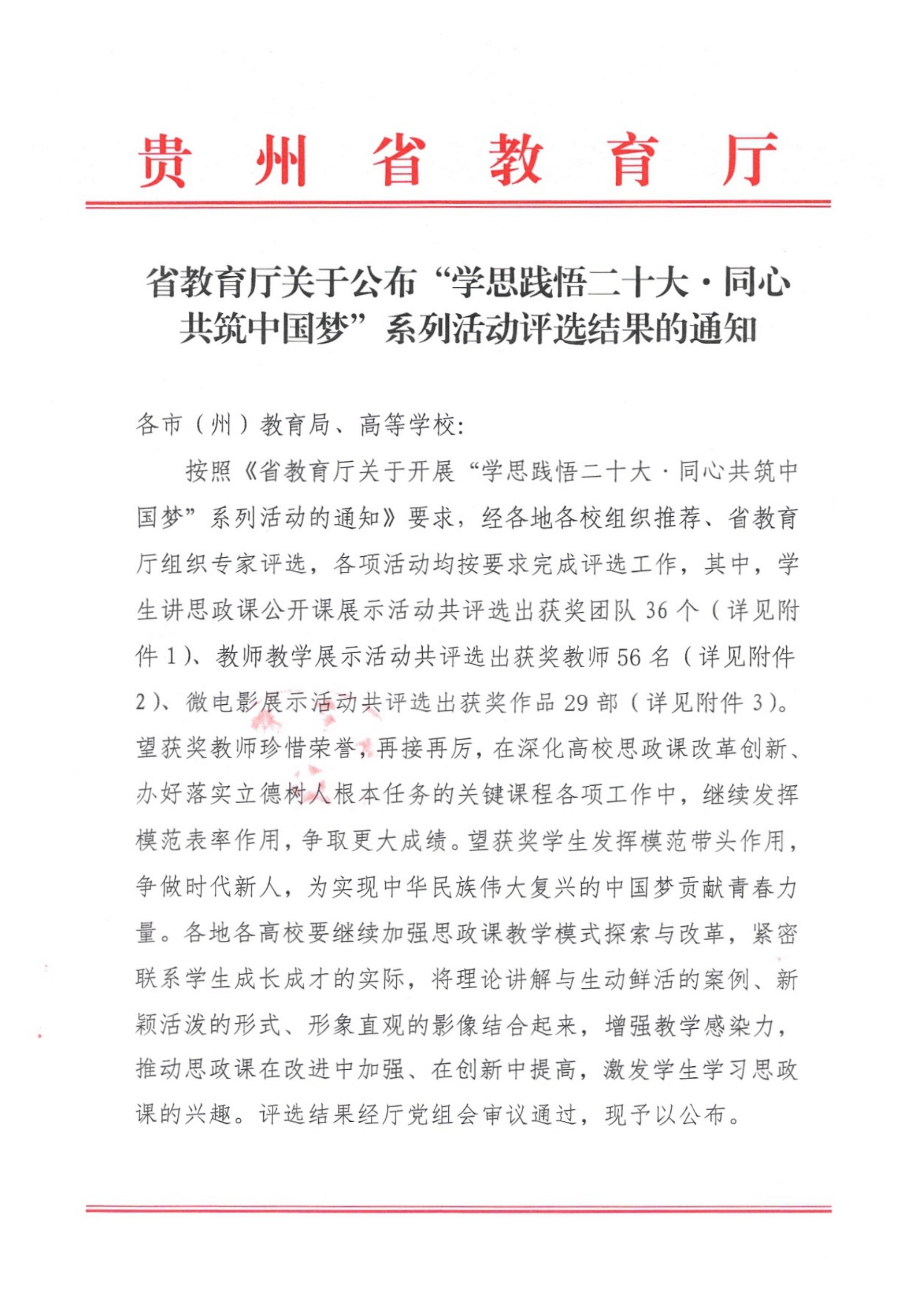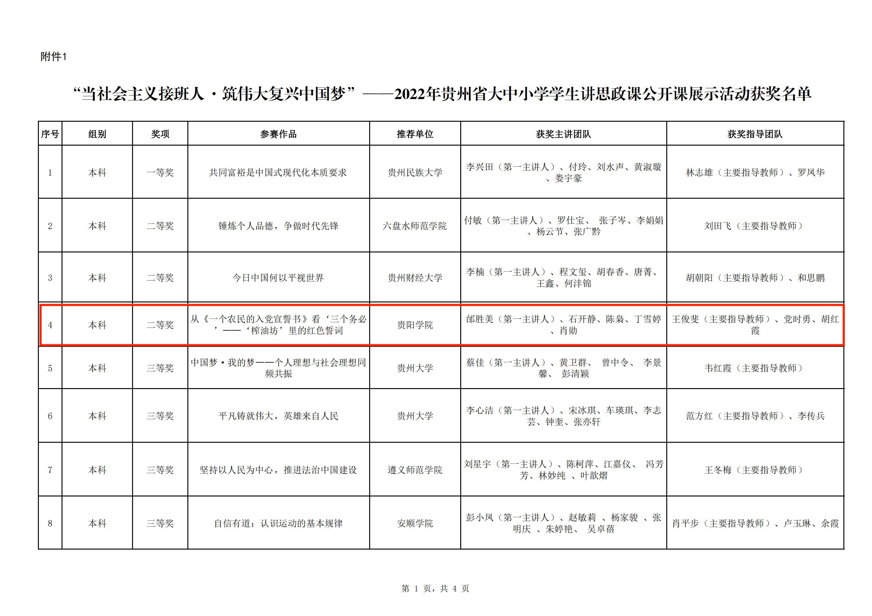 近日,贵州省教育厅公布了“学思践悟二十大·同心共筑中国梦”系列活动评选结果,金年会jinnianhuicom马克思主义学院学生邰胜美主讲的课程《从〈一个农民的入党宣誓书〉看“三个务必”——“榨油坊”里的红色誓词》获“当社会主义接班人·筑伟大复兴中国梦”——2022年贵州省大中小学学生讲思政课公开课展示活动二等奖。马克思主义学院教师曹正勇主讲的研究生课程《新时代中国特色社会主义理论与实践》荣获“同台切磋展风采·勠力同心促提升”——2022年贵州省大中小学思想政治理论课教师教学展示活动三等奖。