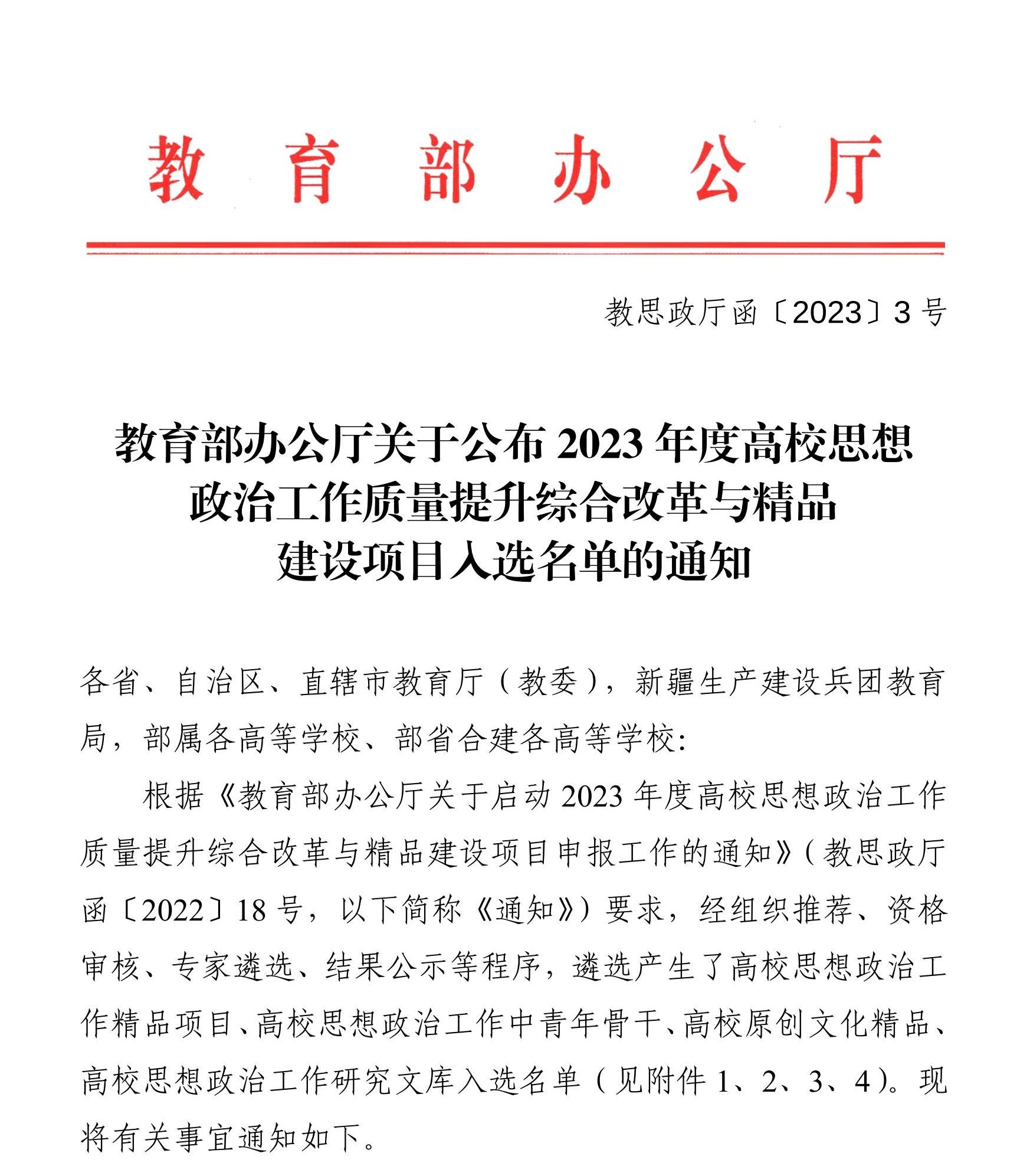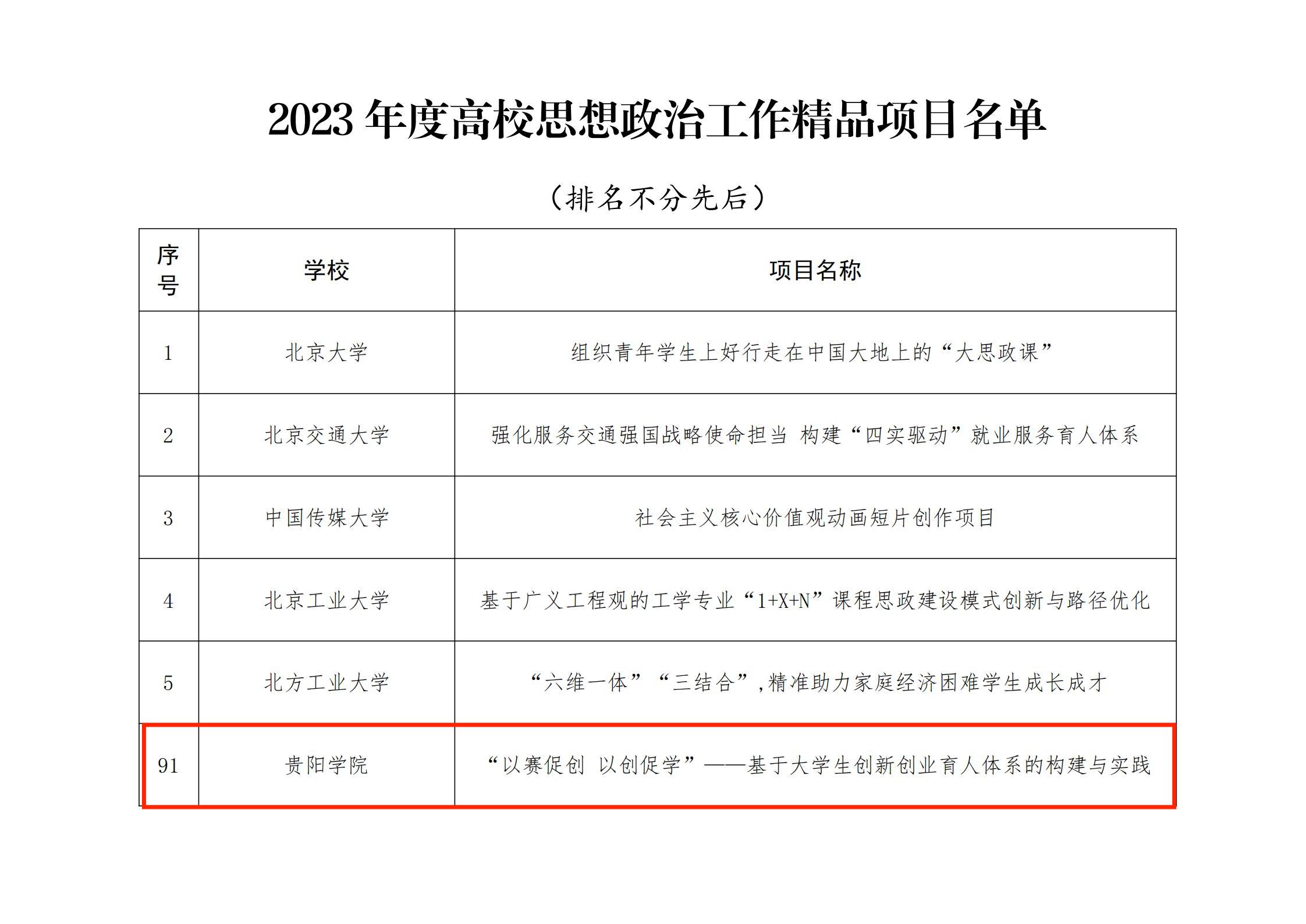 近日,教育部办公厅公布了《教育部办公厅关于公布2023年度高校思想政治工作质量提升综合改革与精品建设项目入选名单的通知》,金年会《“以赛促创 以创促学”——基于大学生创新创业育人体系的构建与实践》作为贵州省唯一入选项目,荣获2023年度高校思想政治工作精品项目。