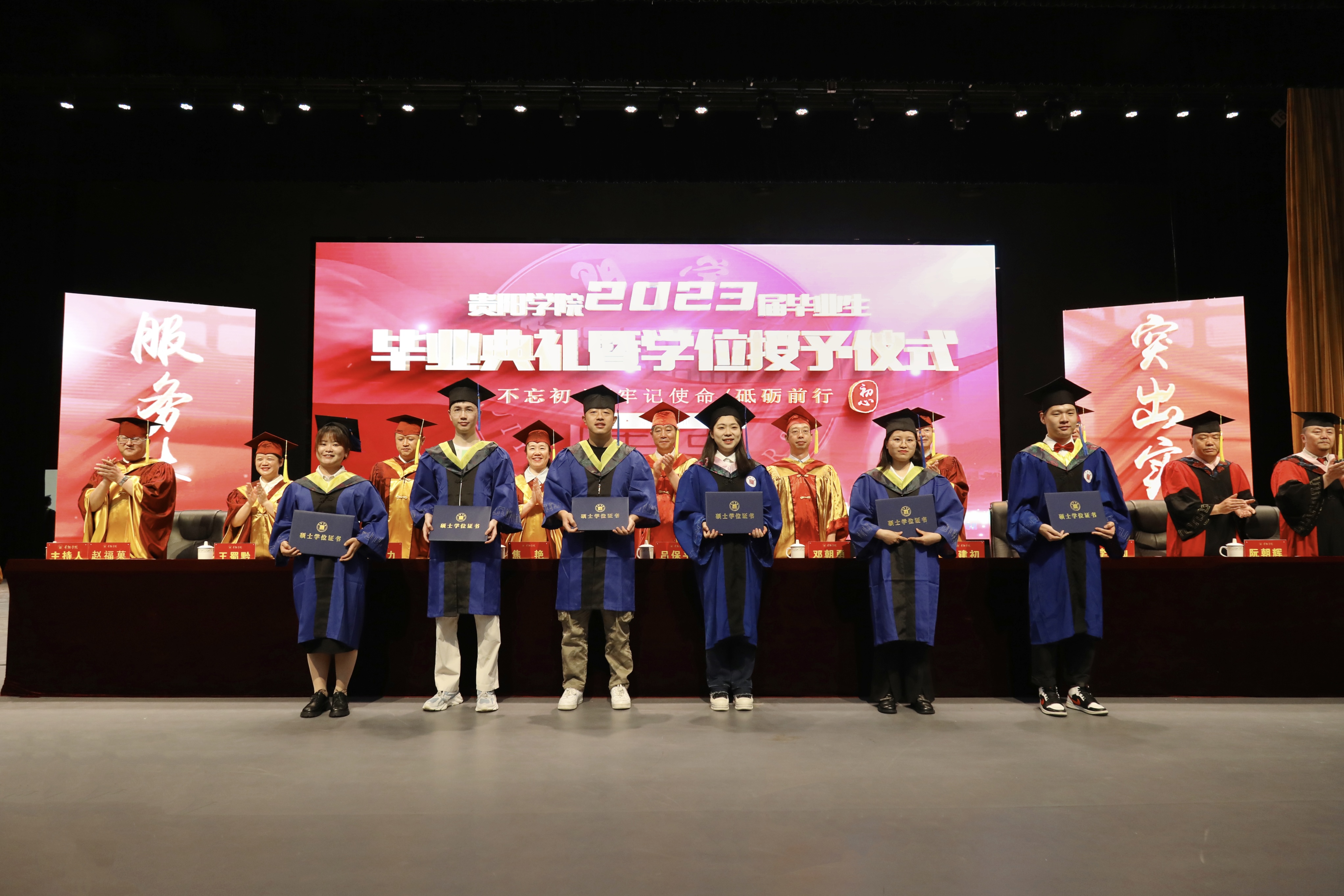 赵福菓宣读表彰2023届省级、校级优秀大学生的决定,全体校领导及导师代表为获表彰的毕业生们颁发证书。