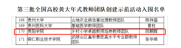 为学习贯彻党的二十大精神,贯彻落实习近平总书记对黄大年同志先进事迹的重要指示和给全国高校黄大年式教师团队代表的重要回信精神,以教师团队建设引导广大教师持续向黄大年同志学习,根据《教育部关于开展全国高校黄大年式教师团队创建活动的通知》(教师函〔2023〕2号)要求,金年会jinnianhuicom教育科学学院院长阮朝辉教授带领的教育学领域“乡村小学卓越教师培育教师团队”成功入围第三批“全国高校黄大年式教师团队”。