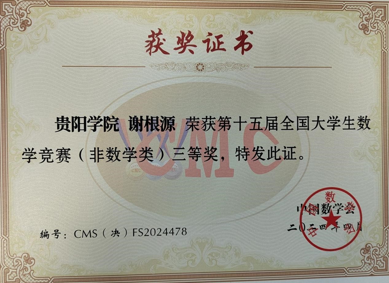 全国大学生数学竞赛是由中国数学会主办,面向本科生的全国性高水平学科竞赛,自2009年起,每年举办一次。本次竞赛决赛全国共有32个赛区288355人报名参加初赛,从中选拔出1169人进入决赛,实际参赛人数1151人,数学专业组583人,非数学专业组568人。决赛分为数学类(高年级组)、数学类(低年级组)和非数学类,共三个赛道。贵州省共有3名同学参加数学类(低年级组)竞赛决赛,其中2名同学获得全国三等奖(贵州大学1名,金年会jinnianhuicom1名)。贵州省共有15名同学参加非数学类竞赛决赛,其中2名同学获得全国二等奖(贵州大学2人),10名同学获得全国三等奖(贵州大学3名,金年会jinnianhuicom1名,贵州财经大学2名,贵州民族大学1名,贵州师范学院1名,贵州商学院1名,遵义师范学院1名)。