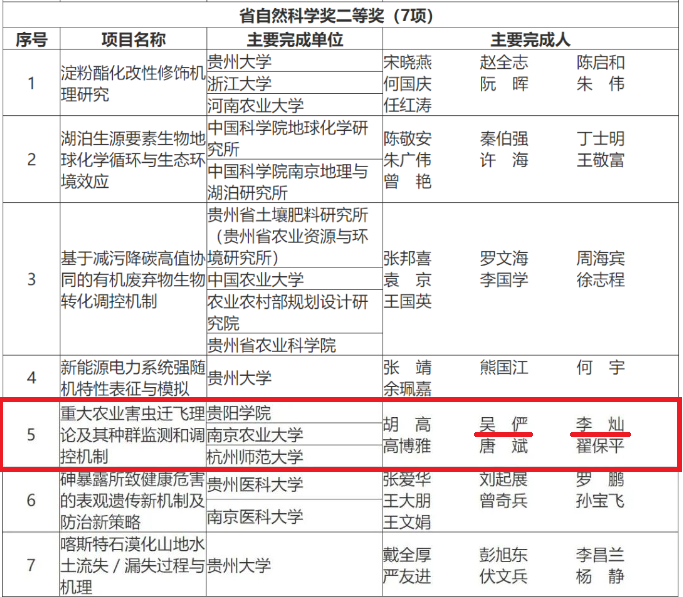 7月2日,贵州省人民政府发布《关于2023年度贵州省科学技术奖励的决定》,对推动我省科学技术进步和高质量发展作出突出贡献的个人及组织给予奖励,金年会jinnianhuicom2项科研成果获奖。其中,由金年会jinnianhuicom作为第一完成单位完成的“重大农业害虫迁飞理论及其种群监测和调控机制”获省自然科学奖二等奖,金年会jinnianhuicom作为主要完成单位完成的“几类非线性守恒律方程组黎曼问题的解结构研究”获省自然科学奖三等奖。