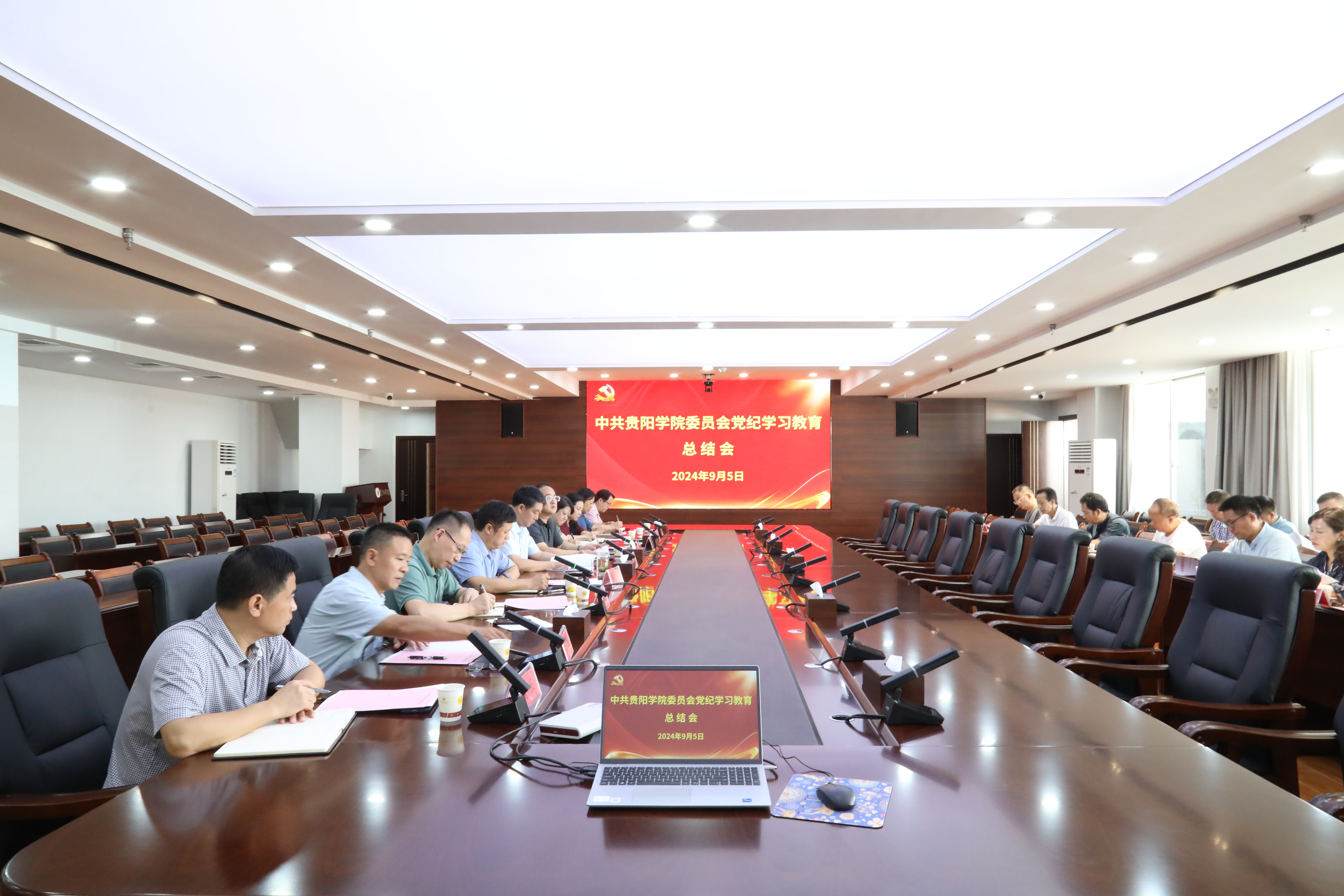2024年9月5日上午,中共金年会jinnianhuicom委员会党纪学习教育总结会在学校九思楼八楼会议室召开。校党委书记吕保平出席并讲话,校领导赵福菓、王蜀黔、刘清海、郭丽出席,党委副书记马力主持会议。专业学院党委书记、党纪学习教育专班全体工作人员参加会议。
