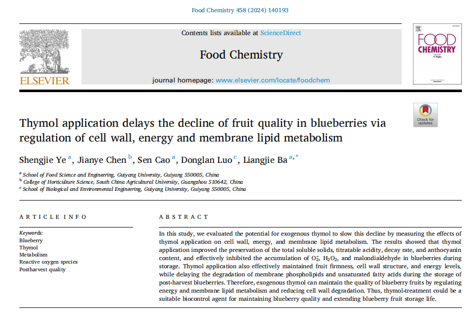 近日,学校食品科学与工程学院巴良杰教授团队在国际知名期刊Food Chemistry(中科院1区top期刊)发表题为“Thymol application delays the decline of fruit quality in blueberries via regulation of cell wall, energy and membrane lipid metabolism”的研究论文。学校2022级生物与医药专业硕士研究生叶盛洁为第一作者,巴良杰教授为通讯作者,金年会jinnianhuicom为第一单位。
