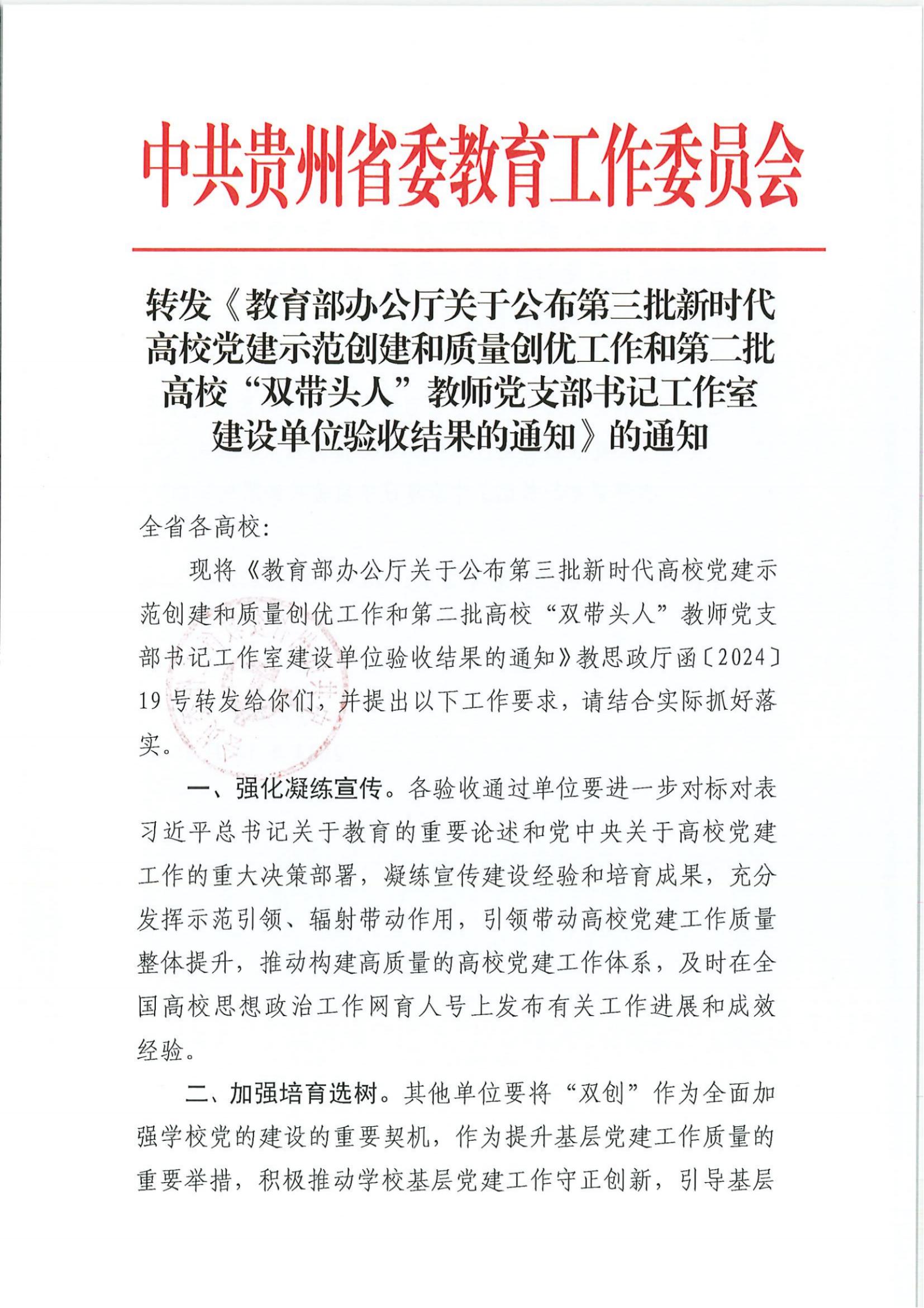 教育部办公厅下发《教育部办公厅关于公布第三批新时代高校党建示范创建和质量创优工作和第二批高校“双带头人”教师党支部书记工作室建设单位验收结果的通知》(教思政厅函〔2024〕19号),金年会jinnianhuicom生物与环境工程学院教师党支部作为第三批“全国党建工作样板支部”建设单位验收通过。
