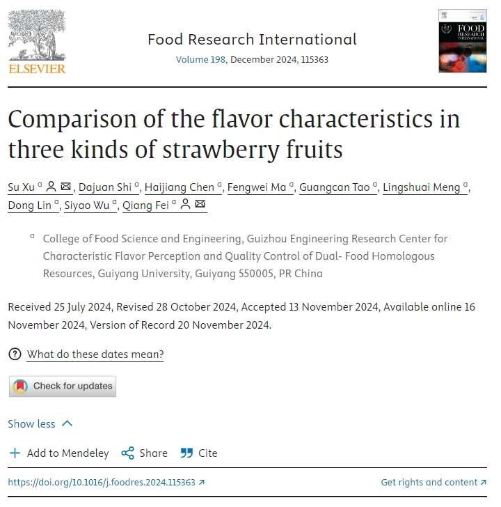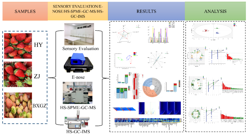 草莓是一种重要的经济作物,各品种在味道、香气和营养价值上存在显著差异。因此,区分和表征不同的草莓品种以评估其品质已成为需要关注的紧迫问题。本研究通过感官评价、理化分析、电子鼻、HS-SPME-GC-MS和HS-GC-IMS评估了三个草莓品种(红颜、章姬、白雪公主)的风味特征。结果表明,章姬草莓甜度最高,而红颜草莓甜度最低。白雪公主草莓的维C、总酚和黄酮类化合物浓度最高。此外,在红颜、章姬和白雪公主草莓中分别鉴定出18、30和33种香气活性值(OAV)大于1的挥发性有机化合物。根据偏最小二乘判别分析(PLS-DA)的结果,3个理化指标、使用HS-SPME-GC-MS检测到的18种挥发性有机物和使用HS-GC-IMS检测到的26种挥发性有机物被确定为潜在的生物标志物。这些发现为草莓品种之间风味差异的鉴别提供了有价值的见解,并建立了一种使用GC-IMS快速分析草莓果实香气的方法。该成果近日在在国际知名期刊《Food Research International》(IF:7.0,中科院1区top期刊)发表,题为“Comparison of the flavor characteristics in three kinds of strawberry fruits”。学校副教授许粟为第一作者,2023级生物与医药专业硕士研究生史大娟为第二作者,副教授许粟、费强为共同通讯作者,金年会jinnianhuicom为唯一单位。