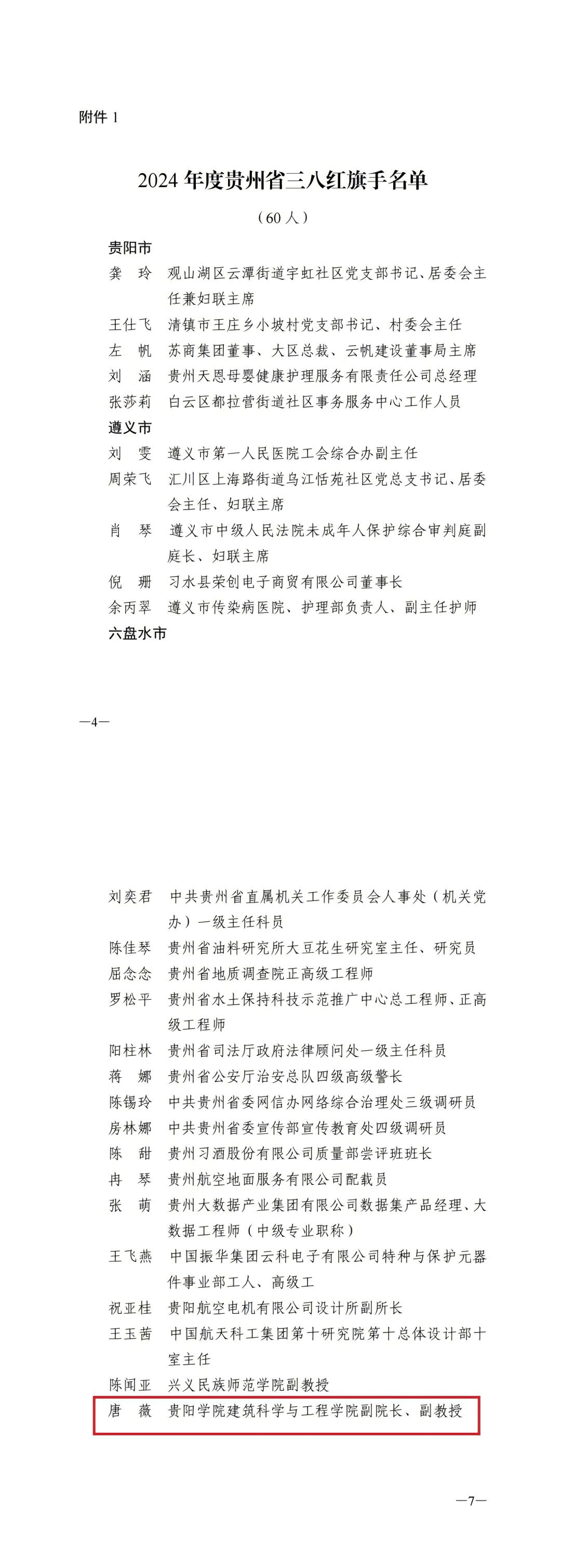 近日,为表彰先进、树立榜样,激励广大妇女自尊自信、自立自强,奋进新征程、建功新时代,省妇联、省人力资源和社会保障厅决定,授予龚玲等60人2024年度贵州省三八红旗手称号。学校建筑科学与工程学院唐薇老师位列其中,荣获2024年度“贵州省三八红旗手”称号!