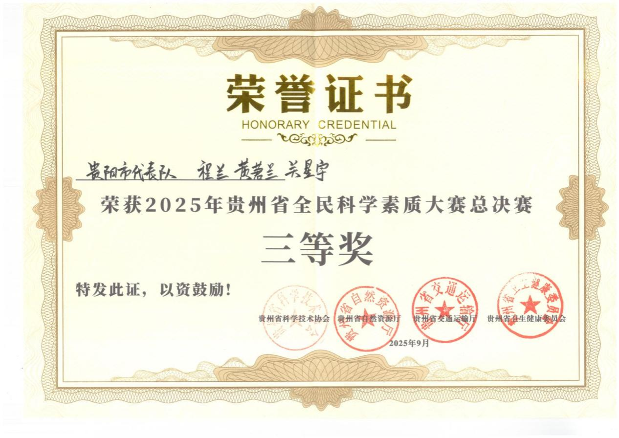 9月25日,作为贵州省2025年全国科普月系列重点活动之一的贵州省全民科学素质大赛总决赛在贵阳举行。学校科学教育专业师生组成的贵阳市代表队,凭借扎实的专业知识储备与出色的团队协作精神,以总分第5名的成绩斩获本次大赛三等奖。