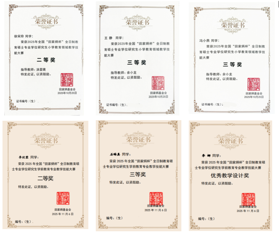 2025年11月,全国“田家炳杯”全日制教育硕士专业学位研究生教学技能大赛圆满落幕。学校教育科学学院2024级6名教育硕士研究生,与全国各高校优秀学子同台竞技、激烈比拼后表现突出,获2项二等奖、3项三等奖和1项优秀教学设计奖,彰显了金年会学子扎实的专业素养与出色的教学能力,教育科学学院硕士生导师何芸、涂显镜获“优秀指导教师奖”,为学校赢得了荣誉。