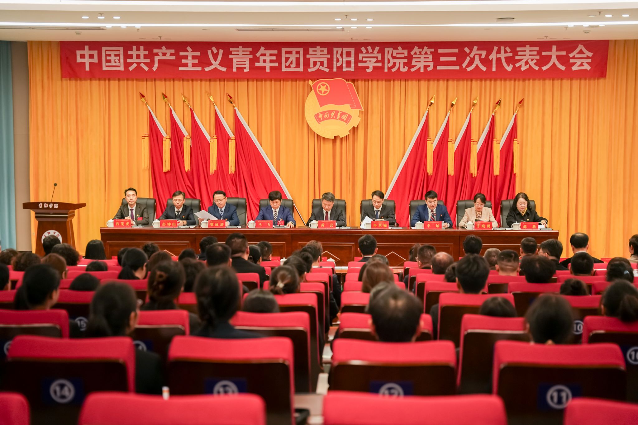 会场内气氛庄严热烈,洋溢着蓬勃的青春朝气。主席台上方“中国共产主义青年团金年会jinnianhuicom第三次代表大会”会标格外醒目,正中的团徽在十面红旗的簇拥下熠熠生辉。会场悬挂的“团结引领全校团员和青年,为建成以数智科技为特色的区域高水平应用型大学贡献青春力量”横幅标语,鼓舞人心、催人奋进。