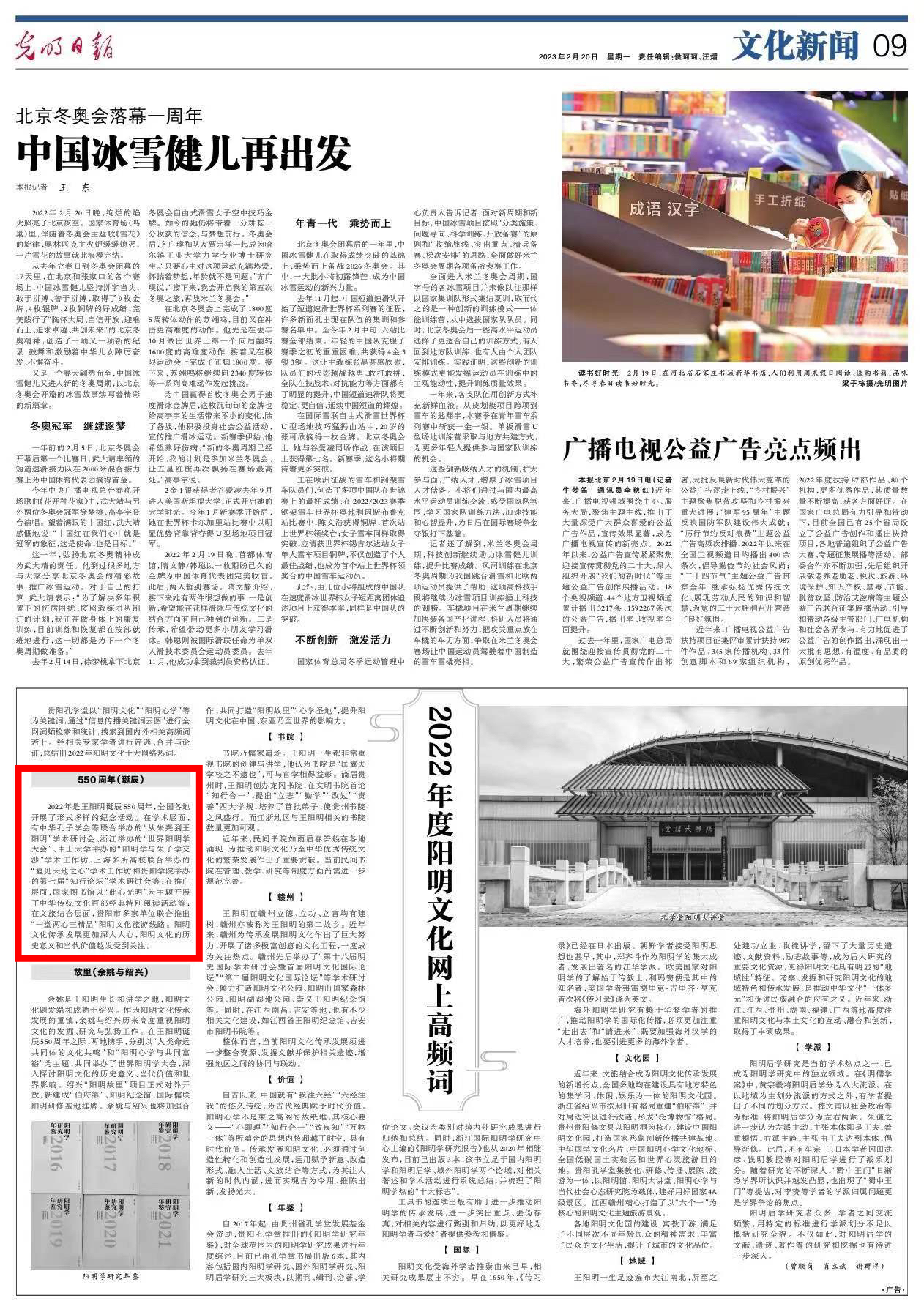 《光明日报》联合贵阳孔学堂以“阳明文化”“阳明心学”为关键词,通过“新浪舆情通”“信息传播关键词云图”对国内外阳明文化发展情况进行全网词频检索,通过数据分析和统计,总结出2022年阳明文化十大网络热词。