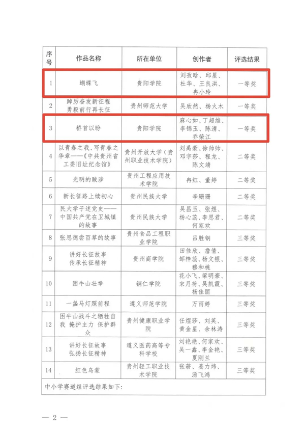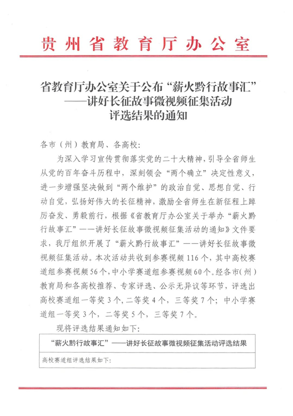 近日,贵州省教育厅组织开展了“薪火黔行故事汇”--讲好长征故事微视频征集活动。此次活动共收到参赛视频116个,其中高校赛道组参赛视频56个,中小学赛道组参赛视频60个。经各市(州)教育局和各高校推荐、专家评选、公示无异议等环节,金年会jinnianhuicom学子刘孜晗、邱星、杜华、王良洪、冉小玲的作品《蝴蝶飞》荣获一等奖;学子麻心如、丁超维、李锦玉、陈清、乔荣江的作品《桥首以盼》荣获一等奖。