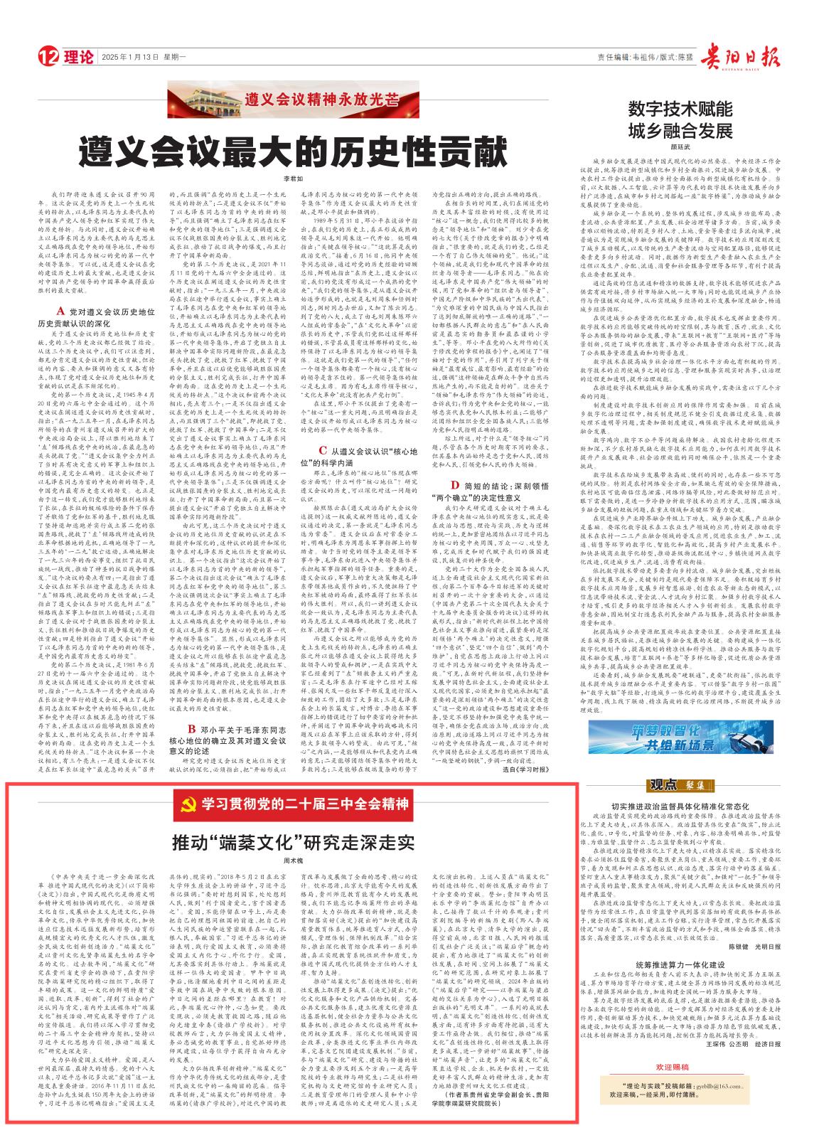 推动“端棻文化”在创造性转化、创新性发展上取得更多成果。《决定》提出:“优化文化服务和文化产品供给机制。完善公共文化服务体系,建立优质文化资源直达基层机制,健全社会力量参与公共文化服务机制,推进公共文化设施所有权和使用权分置改革。深化文化领域国资国企改革,分类推进文化事业单位内部改革,完善文艺院团建设发展机制。”当前,参与“端棻文化”研究、建设与传播的社会力量主要涉及到五个方面:一是高等院校的专业教师与研究生;二是社科研究机构与文史研究馆的专业研究人员;三是教育管理部门的管理人员和中小学教师;四是离退休的文史研究人员;五是文化演出机构。上述人员在“端棻文化”的创造性转化、创新性发展方面作出了十分重要的贡献。譬如:贵阳市南明区永乐中学的“李端棻纪念馆”自开办以来,已接待了数以千计的参观者;贵州京剧院编导的新编历史剧《黔人李端棻》,在北京大学、清华大学的演出,获得空前成功,北京日报、人民网的报道引发社会广泛关注;“端棻后学”概念的提出,有力地推进了“端棻文化”的创新性发展,在时间、空间上拓展了“端棻文化”的研究范围,在研究对象上拓展了“端棻文化”的研究领域。2024年出版的《“端棻后学”研究——以李端棻与梁启超的交往关系为中心》,入选了光明日报出版社的“光明文库”。一系列的成就表明,在“端棻文化”创造性转化、创新性发展方面,还有许多方面有待挖掘,还有大量工作亟待去做。我们相信,推动“端棻文化”在创造性转化、创新性发展上取得更多成果,进一步讲好“端棻故事”、传播好“端棻声音”,让更多的“端棻文化”成果直达学校、企业、机关和农村,一定能更好丰富人民群众的精神生活,更加有力地助推贵州四大文化工程建设。
