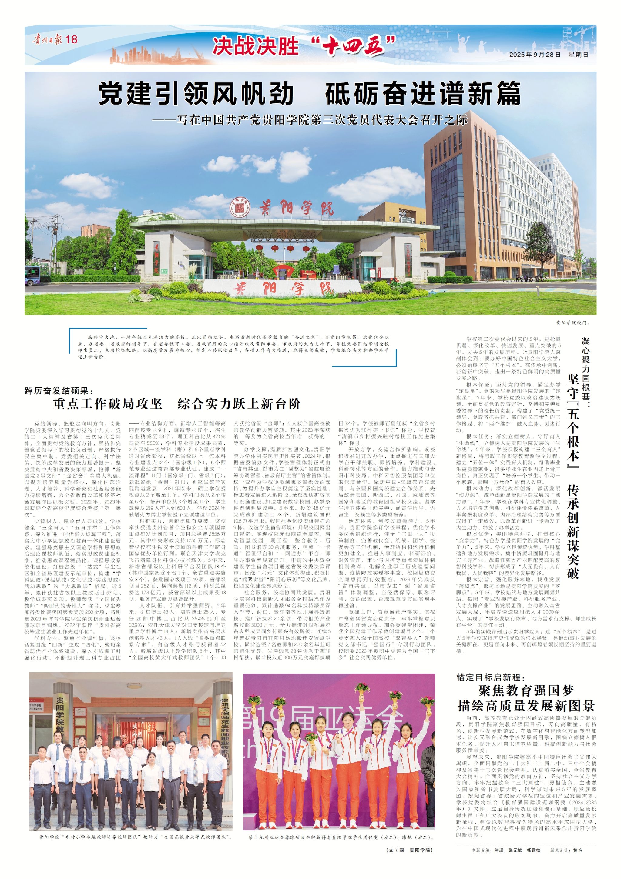 在黔中大地,一所年轻而充满活力的高校,正以昂扬之姿,书写着新时代高等教育的“奋进之笔”。金年会jinnianhuicom第二次党代会以来,在省委、省政府的正确领导和省委教育工委、省教育厅的关心指导以及贵阳市委、市政府的大力支持下,学校党委团结带领全校师生员工,主动抢抓机遇,以高质量发展为核心,坚定不移深化改革,各项工作有力推进,取得显著成效,学校综合实力和办学水平迈上新台阶。