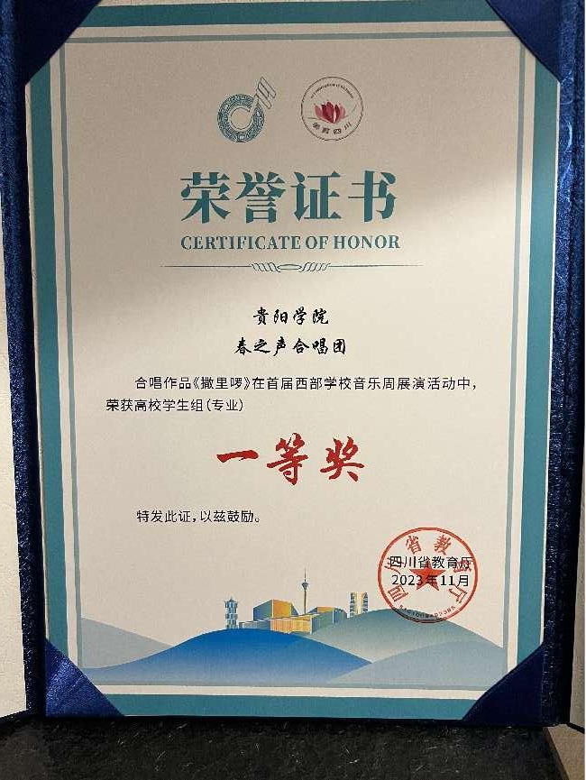 展演分为小学组、中学组、高校组(非专业、专业)三个组别进行展演。由贵州省教育厅选送的金年会jinnianhuicom“春之声”合唱团代表贵州参加展演活动,经过激烈的比拼不负众望,学校“春之声”合唱团荣获了高校学生组(专业)一等奖,为贵州争得了荣誉。