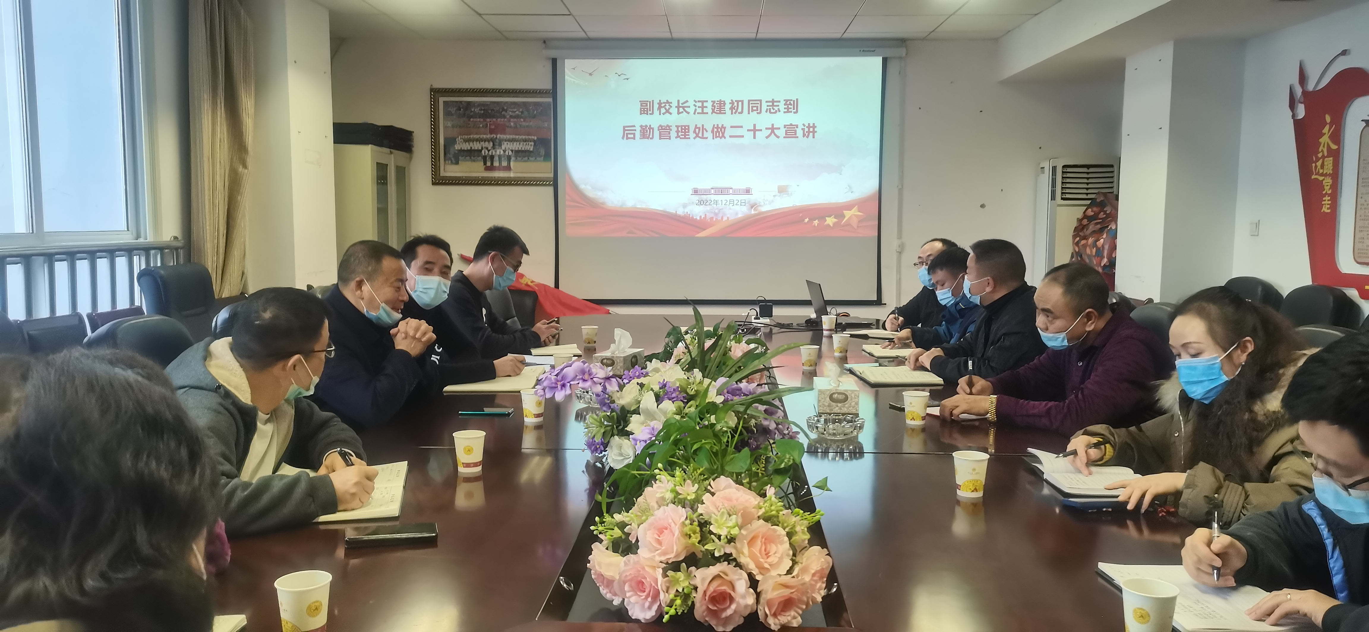 2022年12月2日,金年会党委委员、副校长汪建初到后勤管理处宣讲党的二十大精神,后勤管理处处长冉茂虎,副处长崔寅生、江华,各科室负责人、党员代表、物业公司中层干部、各食堂负责人参加了宣讲报告会,宣讲报告会由冉茂虎主持。