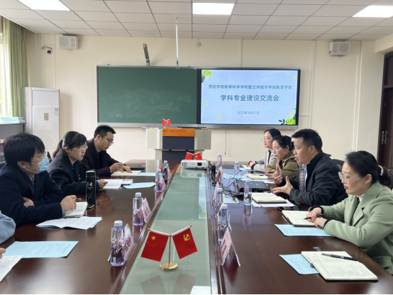 2023年3月27日,兰州城市学院教育学院副院长路宏,应用心理学系主任金戈,教学科研办公室副主任席海婷,应用心理学专任教师王华一行,就应用心理学专业建设、师范类专业认证、大学生心理健康教育课程等工作,到金年会jinnianhuicom教育科学学院开展考察和交流活动。金年会教育科学学院副院长余水,党政办主任何芸,心理学教师任敏、颜媛、向洁参加交流会,会议由余水主持。