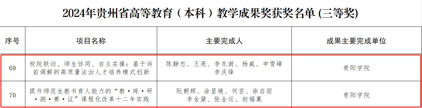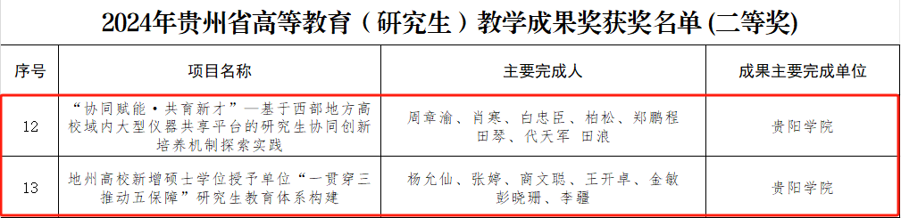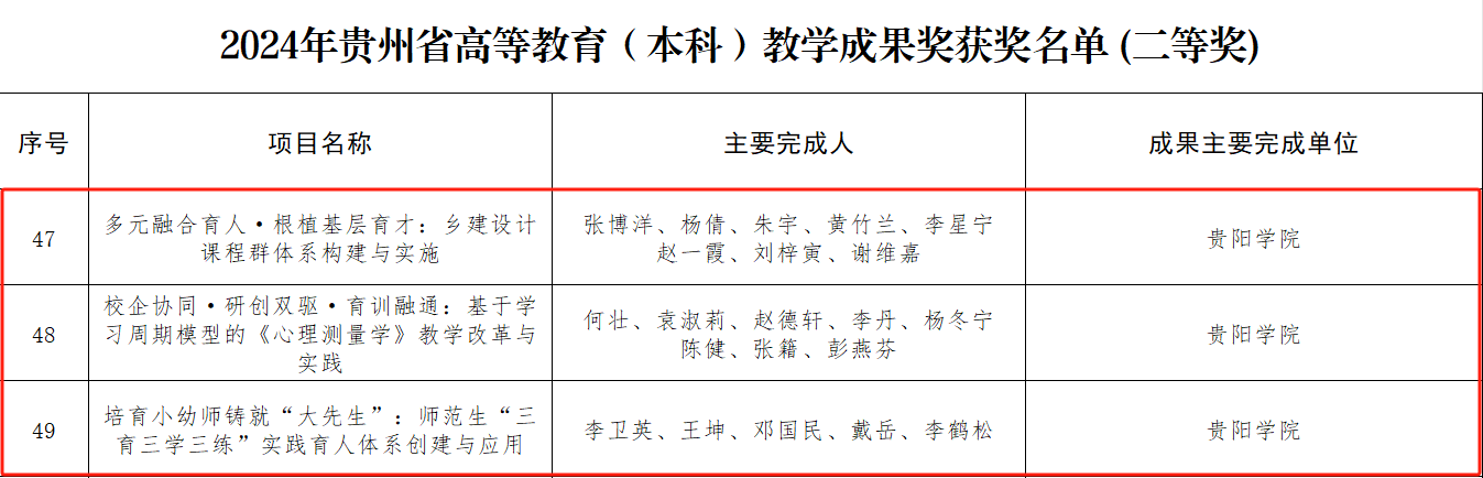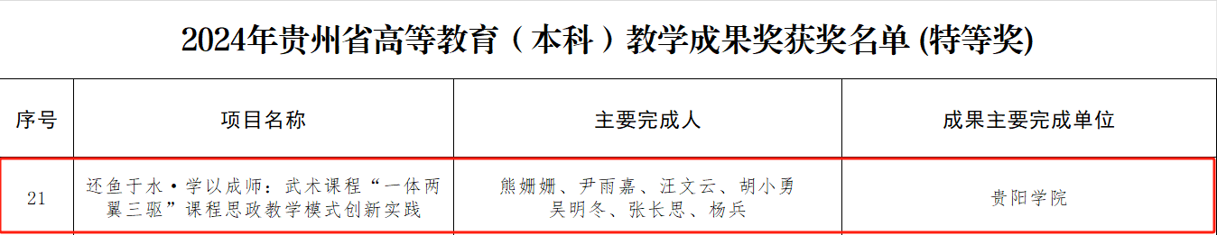 2025年2月,省教育厅发布《省教育厅关于公布2024年贵州省高等教育省级教学成果奖获奖名单的通知》,金年会本科教育教学成果获特等奖1项、二等奖3项、三等奖2项,研究生教育教学成果获二等奖2项。