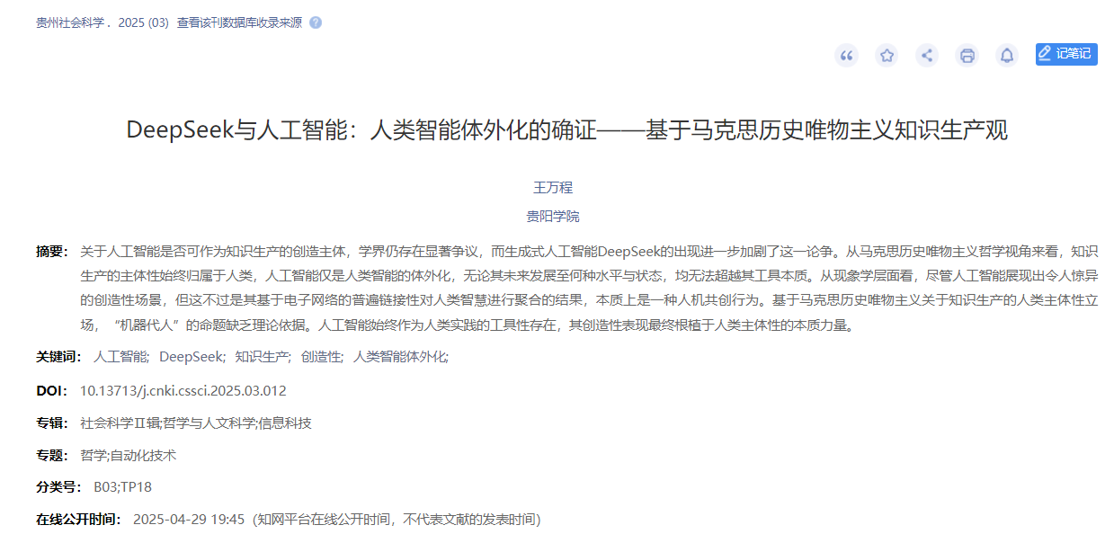 该项研究聚焦人工智能领域核心争议——“人工智能能否成为知识生产的创造主体”这一关键命题展开。王万程创新性地运用马克思历史唯物主义知识生产观,系统论证了人工智能的“工具性”本质。研究指出,无论人工智能发展到何种水平,其本质始终是人类智能的体外化延伸,知识生产的本体性主体只能是人类。通过对生成式人工智能DeepSeek的深入分析,研究揭示了人工智能“创造性表现”的本质特征。该研究成果发表在中文社会科学引文索引(CSSCI)来源期刊《贵州社会科学》,题为《DeepSeek与人工智能:人类智能体外化的确证——基于马克思历史唯物主义知识生产观》。