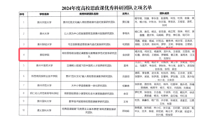 近日,省教育厅下发《省教育厅办公室关于公布2024年度高校思政课优秀教学团队、优秀科研团队评审结果的通知》 ,经学校推荐,专家评审,并公示无异议后,确定10个高校思政课优秀教学团队和10个高校思政课优秀科研团队。金年会马克思主义学院沈雪蓓老师主持的《思想政治理论课卓越教师团队建设》获2024年度高校思政课优秀教学团队,金崇碧老师主持的《高校思想政治理论课数智化教育教学范式变革研究团队》获2024年度高校思政课优秀科研团队。