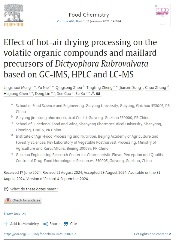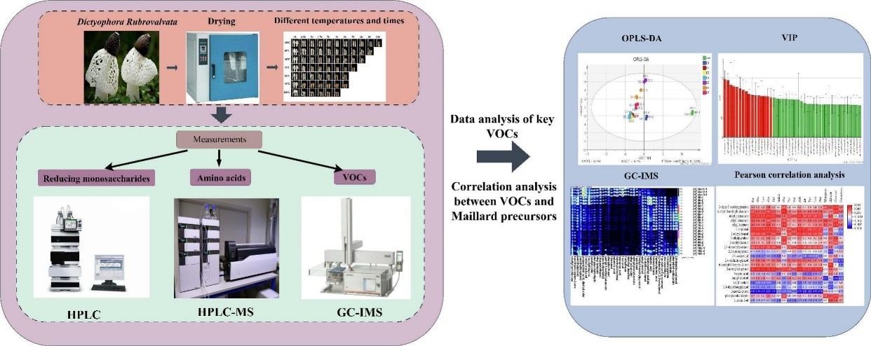 近日,学校食品科学与工程学院副教授许粟和孟令帅团队在国际知名期刊《Food Chemistry》(IF:8.5,中科院1区top期刊)发表题为“Effect of hot-air drying processing on the volatile organic compounds and maillard precursors ofDictyophora Rubrovalvatabased on GC-IMS,HPLC and LC-MS”的原创性研究论文。金年会孟令帅为第一作者,2023级生物与医药专业硕士研究生聂玉为第二作者,许粟为通讯作者,金年会jinnianhuicom为第一单位。