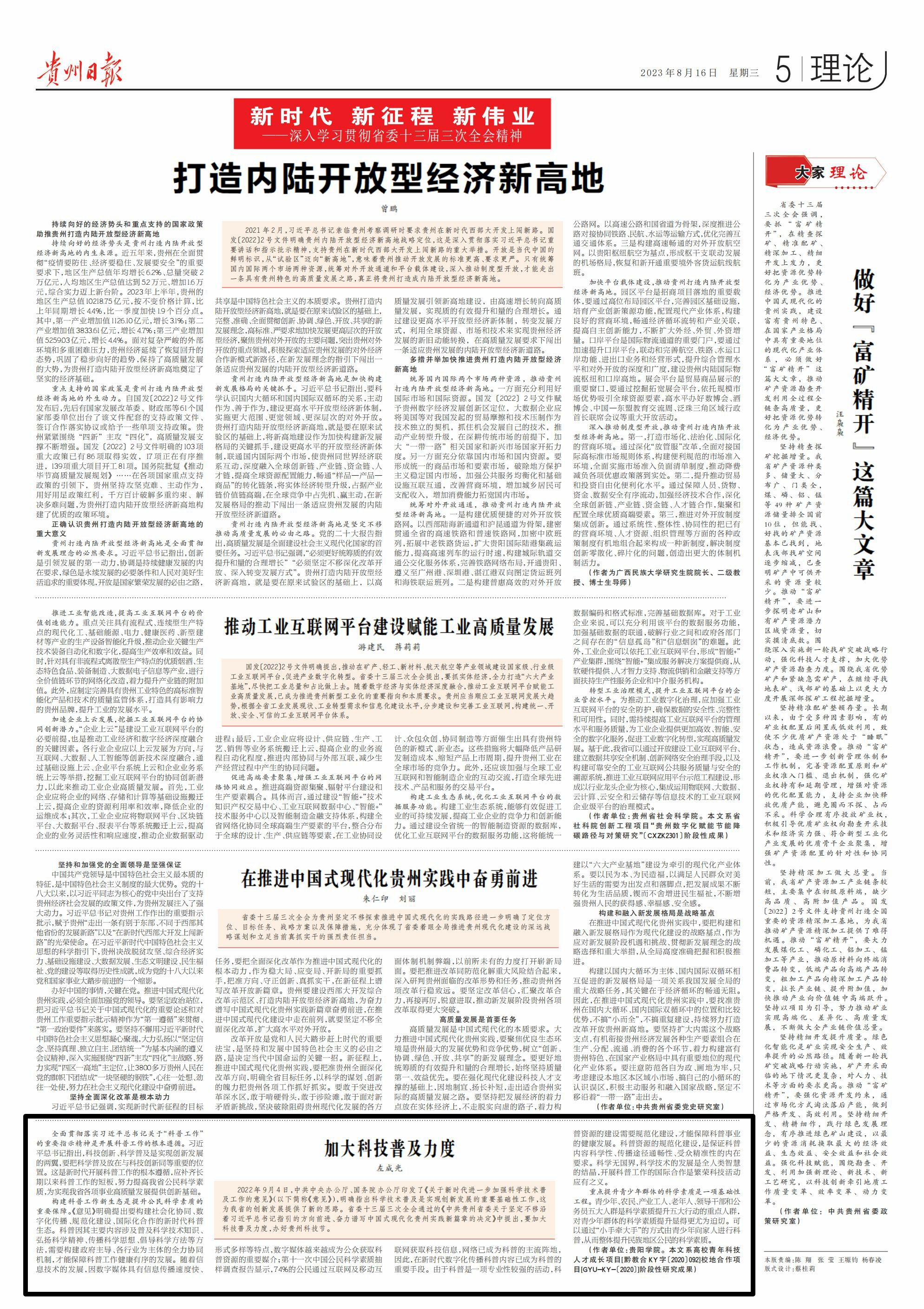 习近平总书记在中共中央政治局第三次集体学习时强调“要加强国家科普能力建设”。党的二十大报告将科普作为提高全社会文明程度的重要举措,强调“培育创新文化,弘扬科学家精神,涵养优良学风,营造创新氛围”“健全基本公共服务体系,提高公共服务水平”“加强国家科普能力建设”。这一系列重要论述为加强新时期科普工作指明了方向。为深入学习领悟习近平总书记关于“要加强国家科普能力建设”的重要讲话精神,学校材料科学与工程学院教师左成光发表理论文章《加大科技普及力度》进行阐释,并刊登在贵州日报理论版,原文如图。